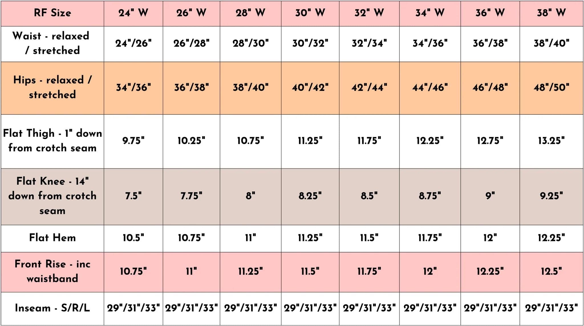 - Our sizes are listed with the waist size first, followed by the inside leg measurement. Both in inches.