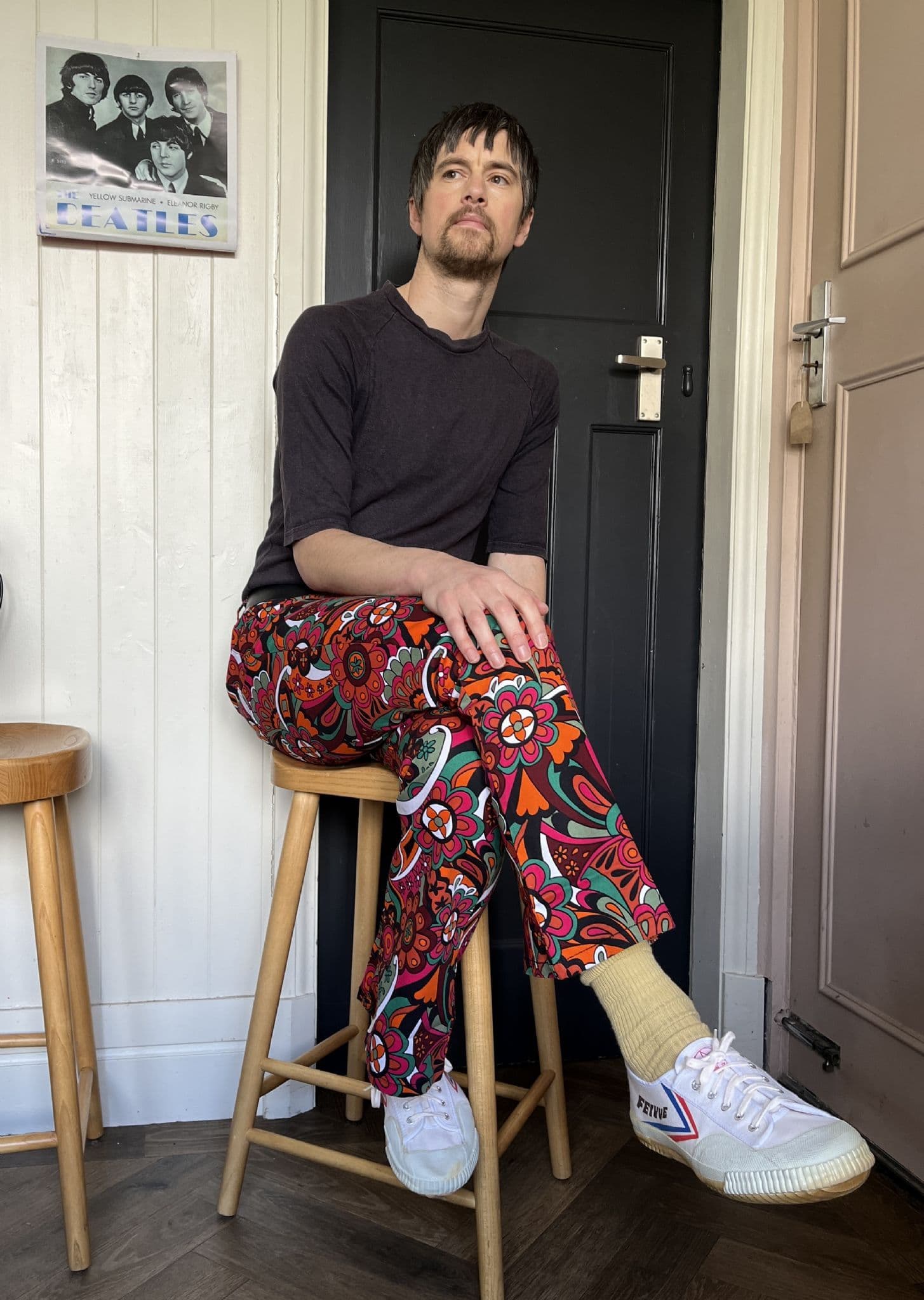 These were inspired by the classic psychedelic and hippy period in the 1960s and early 1970s. Carnaby Street and bands like Dave Dee Dozy Beaky Mick & Tich, The Kinks, The Beatles, Small Faces, The Who, Jimi Hendrix etc. Our flares have been designed to fit slimmer on the thigh and then kick out from the knee down, bell-bottom style.